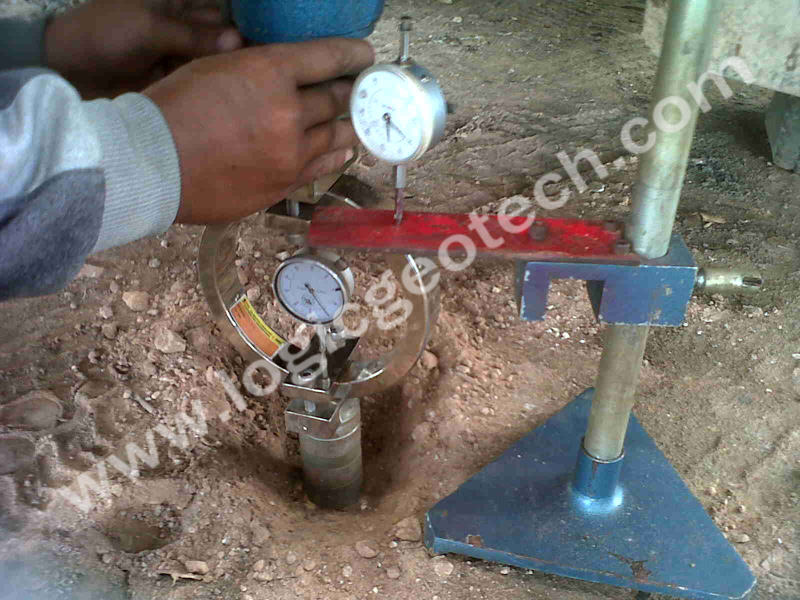 Plate Load Test is a field test for determining the ultimate bearing capacity of soil and the likely settlement under a given load. The Plate Load Test basically consists of loading a steel plate placed at the foundation level and recording the settlements corresponding to each load increment. The test load is gradually increased till the plate starts to sink at a rapid rate. The total value of load on the plate in such a stage divided by the area of the steel plate gives the value of the ultimate bearing capacity of soil. Theultimate bearing capacity of soil is divided by suitable factor of safety (which varies from 2 to 3) to arrive at the value of safe bearing capacity of soil.